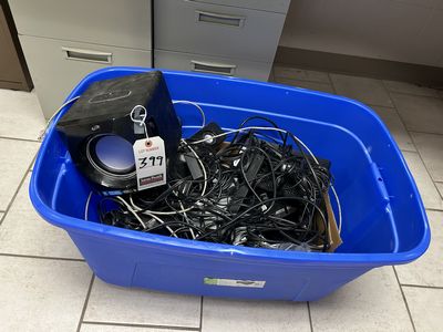 399 | LOT |  | ASS'T CAT 5 CABLE, ELEC. CORDS, AUDIO SPEAKERS W/ POLY BIN |
