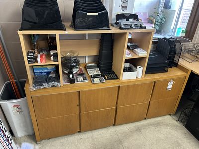 438 | |  | 5'X7'X6' U-SHAPED FORM. OFFICE WORKSTATION, W/ STOR. CAB.'S & OVERSHELVES |