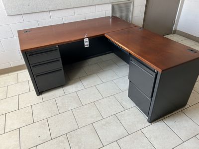 400 | |  | 6'X8' L-SHAPED FORM. & MET. OFFICE WORKSTATION, W/ STOR. CAB.'S & OVERSHELVES |
